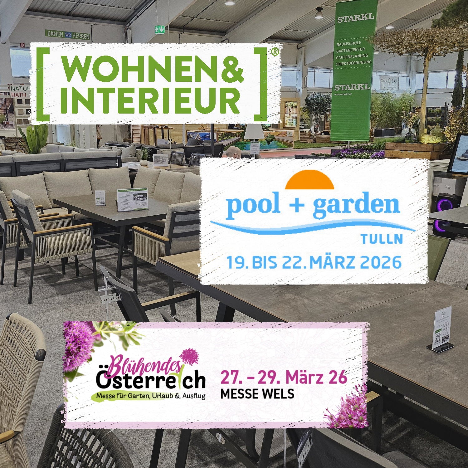Wohnen & Interieur (Wien), Pool + Garten (Tulln) und Blühendes Österreich (Wels).