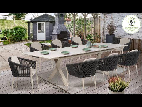 Der Gartentisch Cameron verbindet luxuriöse Materialien mit cleverer Funktionalität und ist in zwei stilvollen Farbvarianten und drei Größen erhältlich. Egal, ob für gemütliche Familienessen oder gesellige Runden mit vielen Gästen, dieser Tisch passt sich mühelos deinen Bedürfnissen an und bringt modernen Stil in deinen Außenbereich.