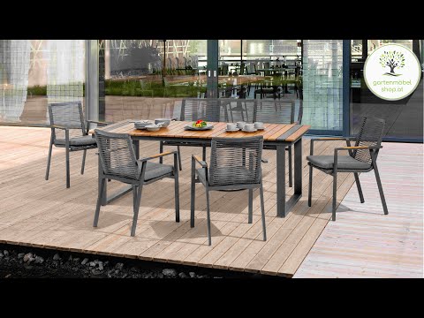 Die Sofagruppe Sasa verbindet modernes Design mit hochwertigen Materialien und cleverer Funktionalität. Mit einer 3er-Bank, vier Armstühlen und einem Esstisch bietet sie Platz für gesellige Runden und verleiht deinem Außenbereich eine stilvolle Atmosphäre.