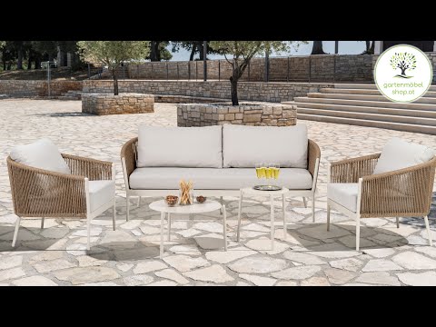 - Covering: The backrests of the seating furniture are covered with handmade textile cords in the color sand, which not only look modern and stylish, but are also weatherproof and durable.