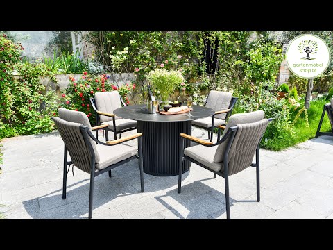 The Cassiopeia garden table harmonizes perfectly with the Tristan garden chairs . With their aluminum frame in dark gray, the elegant teak details and the comfortable cushions in light gray, they form a stylish addition to this table. Together they create an elegant ensemble that combines comfort and aesthetics.