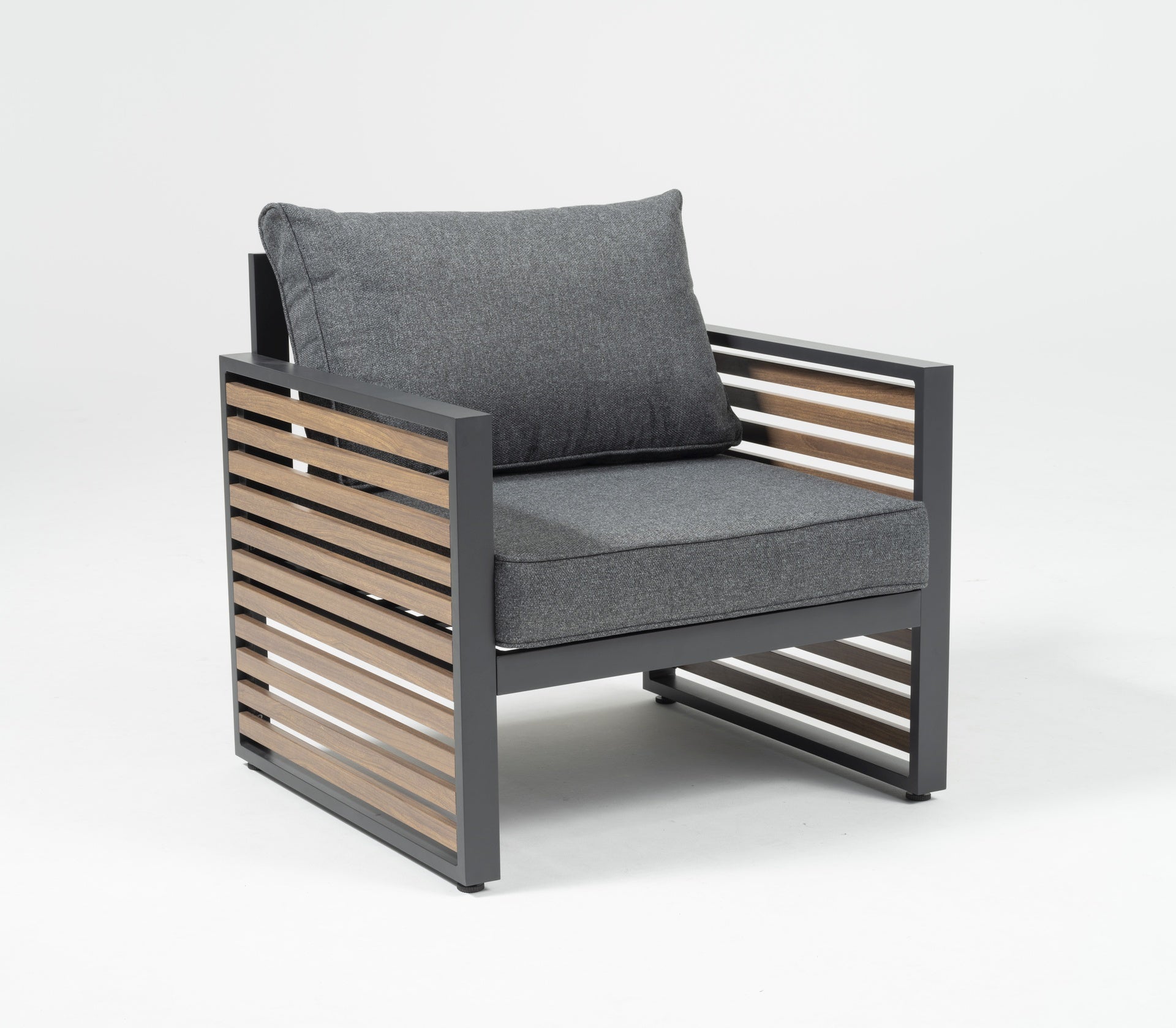 Cushions: Weather-resistant dark grey textile cushions that guarantee high seating comfort and durability.